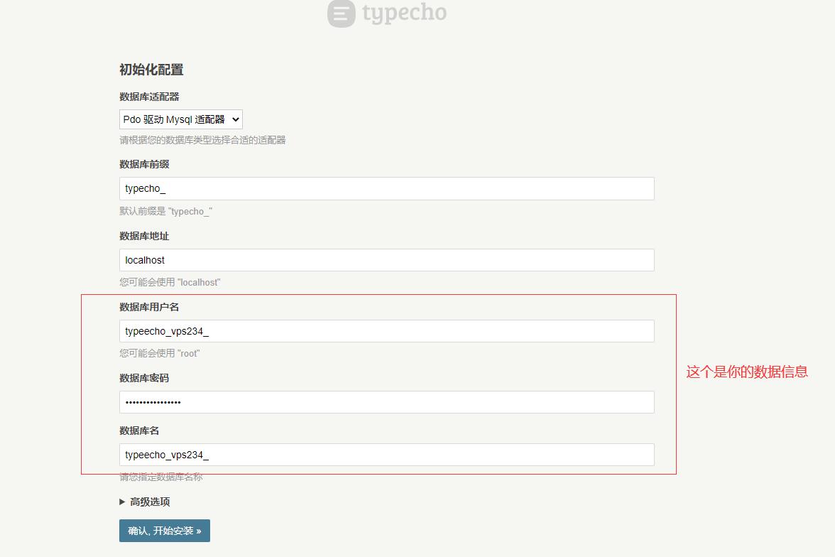 然后直接开始安装,跳转后需要填写数据库信息,如果前面你没有保存就到“数据库”菜单下去查看: