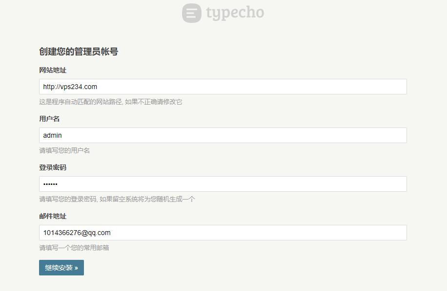 然后你就可以在浏览器访问“你的域名/install.php”,比如我就访问 vps234.com/install.php。